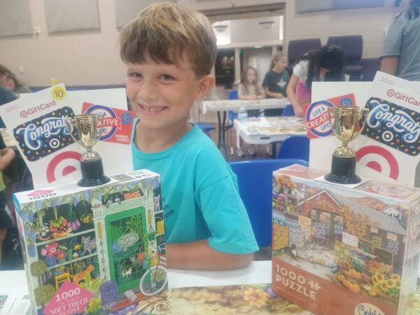 I feel like this deserves its own post. Last night Luke and I went to a jigsaw puzzle competition put on by a schoolmate at a nearby church. There were 35 teams of two vying to complete a 300 piece puzzle the fastest. Our system was for me to separate the edge pieces and pass them to him for assembly. We then divided the remaining pieces by color and then latched them together. I assumed we were doing well because we were ahead of the folks nearest us, and we did in fact finish before anyone else. Luke was pretty ecstatic. Prizes included a trophy, puzzle, and gift cards for each of us.